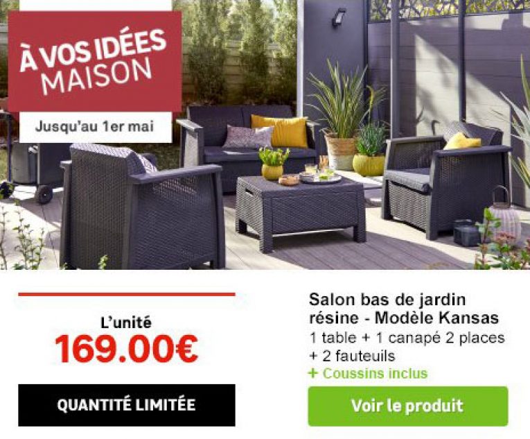 Le salon de jardin Leroy Merlin à moins de 170 € est une offre temporaire destinée aux clients en France métropolitaine. En effet, il sera uniquement au prix de 169€ jusqu’au 1er mai 2017, et dans la limite des stocks disponibles.